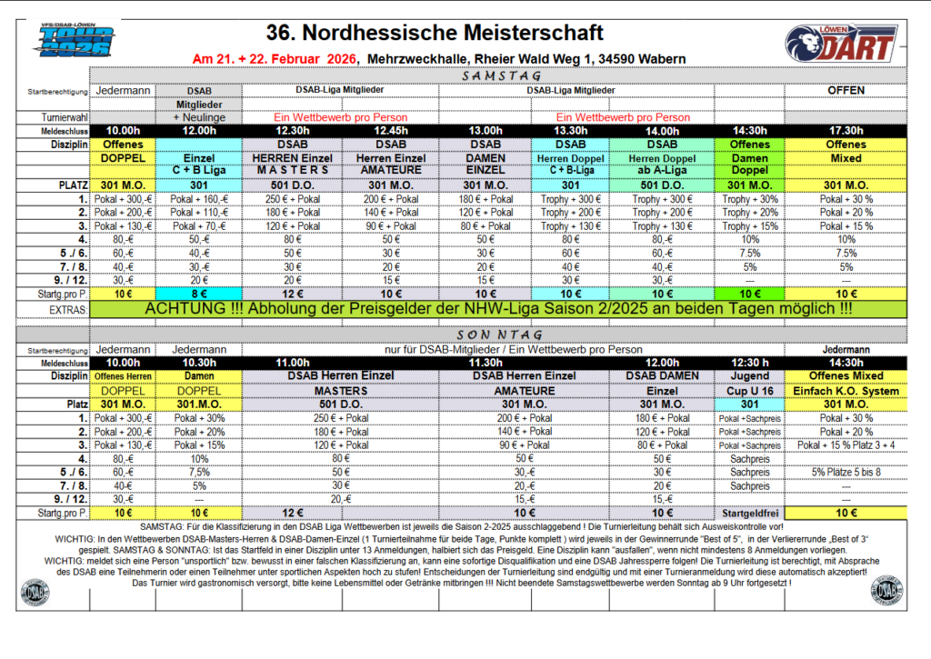 Die VFS/DSAB-Löwen Tour ist eine Turnierserie im E-Darts, die größte und bedeutendste in Deutschland. Diese Superlative haben nicht nur Gültigkeit für den Bereich E-Darts, sondern obendrein für Darts schlechthin. Die Matchmaker der Tour: Veranstalter: VFS/DSAB Ausrichter: VFS-Mitglieder Hauptsponsor: Löwen Dart In der Regel handelt es sich bei den Turnieren der VFS/DSAB-Löwen Tour um zweitägige Veranstaltungen (Samstag/Sonntag), in Ausnahmefällen auch (Freitag/Samstag) oder als eintägige Turnier am Samstag oder Sonntag. Eine ganz besondere Charakteristik der Tour sind ihre Punkte-Ranglisten, die sich wie ein roter Faden durch die gesamte Serie ziehen. Insgesamt gibt es zehn verschiedene Rankings (Einzel, Doppel, Mixed). Am Ende der Saison werden die besten Spieler:innen mit sogenannten VFS-Bonbons (Sportförderpreise) besonders belohnt, die stets bei den Deutschen Meisterschaften am Ende der Spielzeit verteilt werden. Die VFS/DSAB-Löwen Tour berücksichtigt auf ihren Turnieren verschiedenste Leistungskategorien wie Frauen, Männer (Amateure und Masters), Liga-Klassen sowie Jugend und Neulinge. Die individuelle Zusammensetzung hinsichtlich der angebotenen Wettbewerbe der jeweiligen Turniere ist Sache des Ausrichters, der aus einem vorgegebenen Katalog von Disziplin-Varianten seine bevorzugten Wettbewerbe auswählt. Dabei sind Startgelder, Sportförderpreise, Modi etc. generell festgelegt.