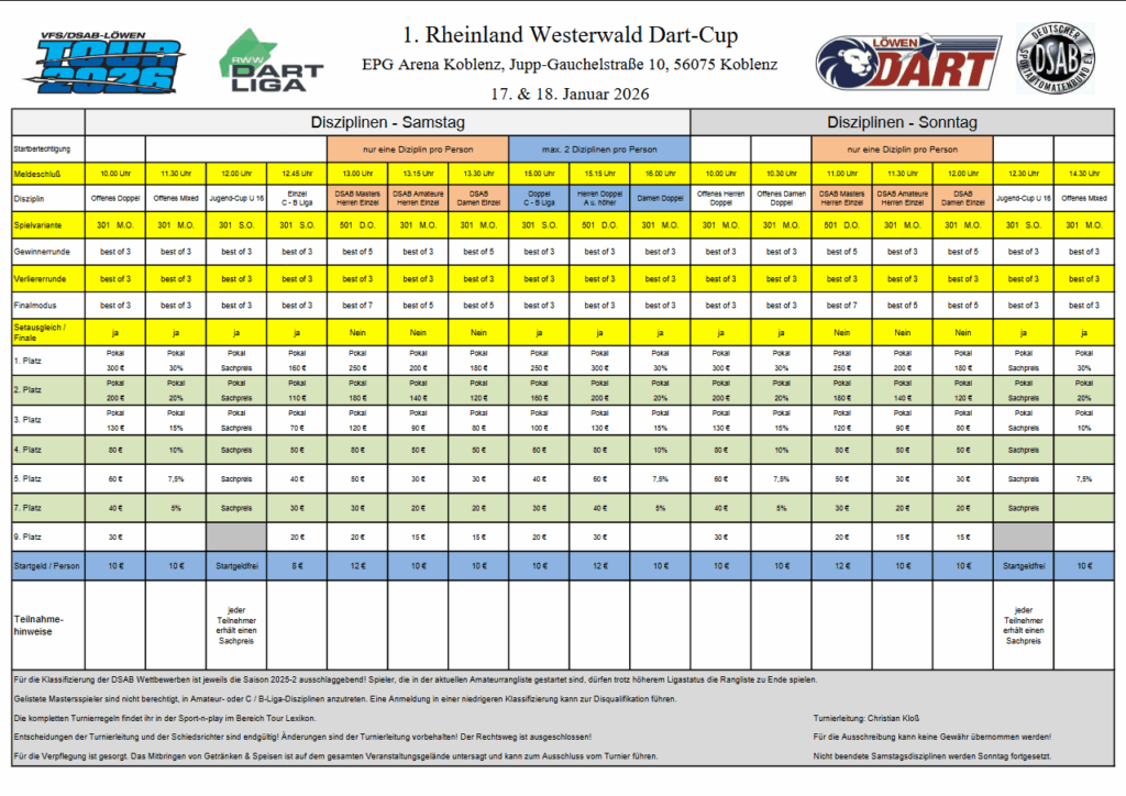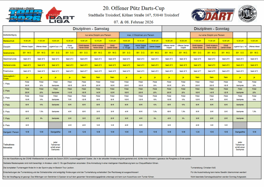 Die Turnierausschreibungen sind mit dem Namen verlinkt sobald uns diese vorliegen. Dort könnt ihr euch über alle angebotenen Disziplinen, Start- und Preisgelder informieren.