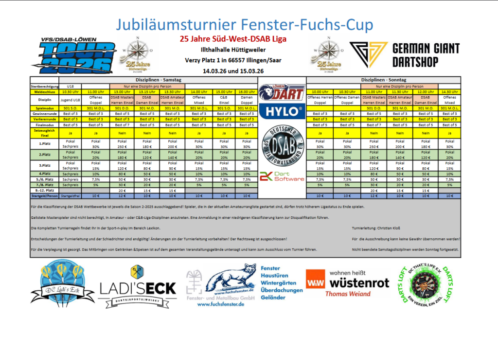 | 13.-15. März | Jubiläumsturnier 25 Jahre Süd-West DSAB Liga Ausschreibung… ![]() | Illtalhalle Hüttigweiler Verzy Platz 1 66557 Illingen |